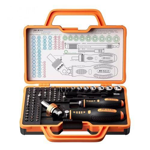 JAKEMY JM-6111 69 in 1 Screwdriver Repair Tool delivers extensive versatility for precision repairs and maintenance tasks. This comprehensive kit includes dual ratchet handles, a wide selection of bits, sockets, extensions, and additional accessories in a portable case. It supports professional and DIY work on electronics, appliances, and mechanical items with reliable performance.